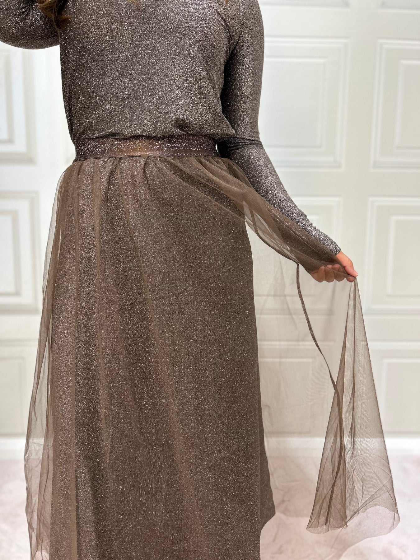 The Costa Mani Otto Skirt in Choco is an elegant and effortlessly chic piece that adds a touch of sophistication to any outfit. Featuring a soft shimmer base layered with a delicate tulle overlay, this skirt creates beautiful movement and subtle sparkle with every step.