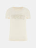 Effortlessly chic, this cream t-shirt combines comfort with contemporary style. Crafted from soft stretch cotton jersey, it features a classic crew neck and short sleeves for everyday versatility. The standout oversized logo adorned with sparkling rhinestones adds a touch of glamour, while the slim fit silhouette flatters your figure. Perfect for dressing up casual looks or pairing with your favourite jeans.