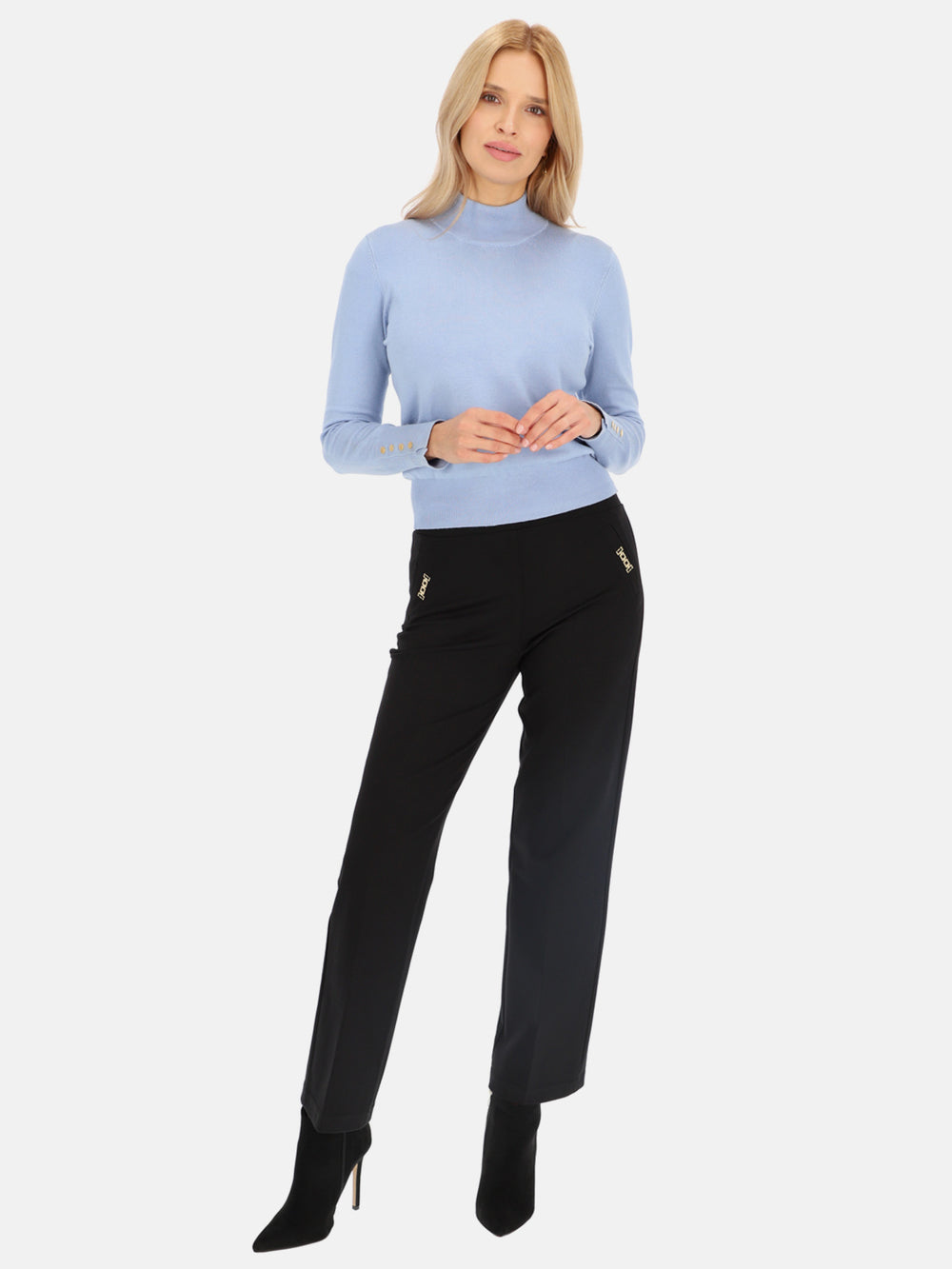 Elevate your wardrobe with the Bariloche Navy Trouser Lupino, crafted from sleek black jersey for a refined yet comfortable fit. Featuring elegant mock slant pockets accented with gold hardware, these trousers combine subtle luxury with practical design. The elasticated waistband ensures ease and flexibility without compromising style, making them an ideal choice for polished, sophisticated looks.