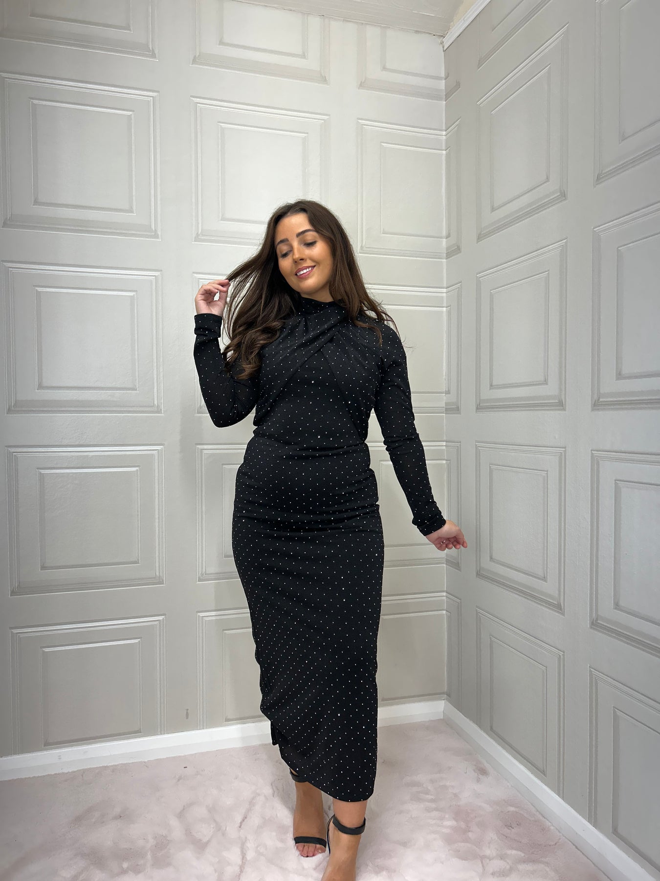 Sparkle meets sophistication. Our Shosana Hotfix Diamante Wrapover Midi Dress features a high wrapover designed neckline and semi-sheer sleeves, whilst adorned with all-over hotfix diamantes.