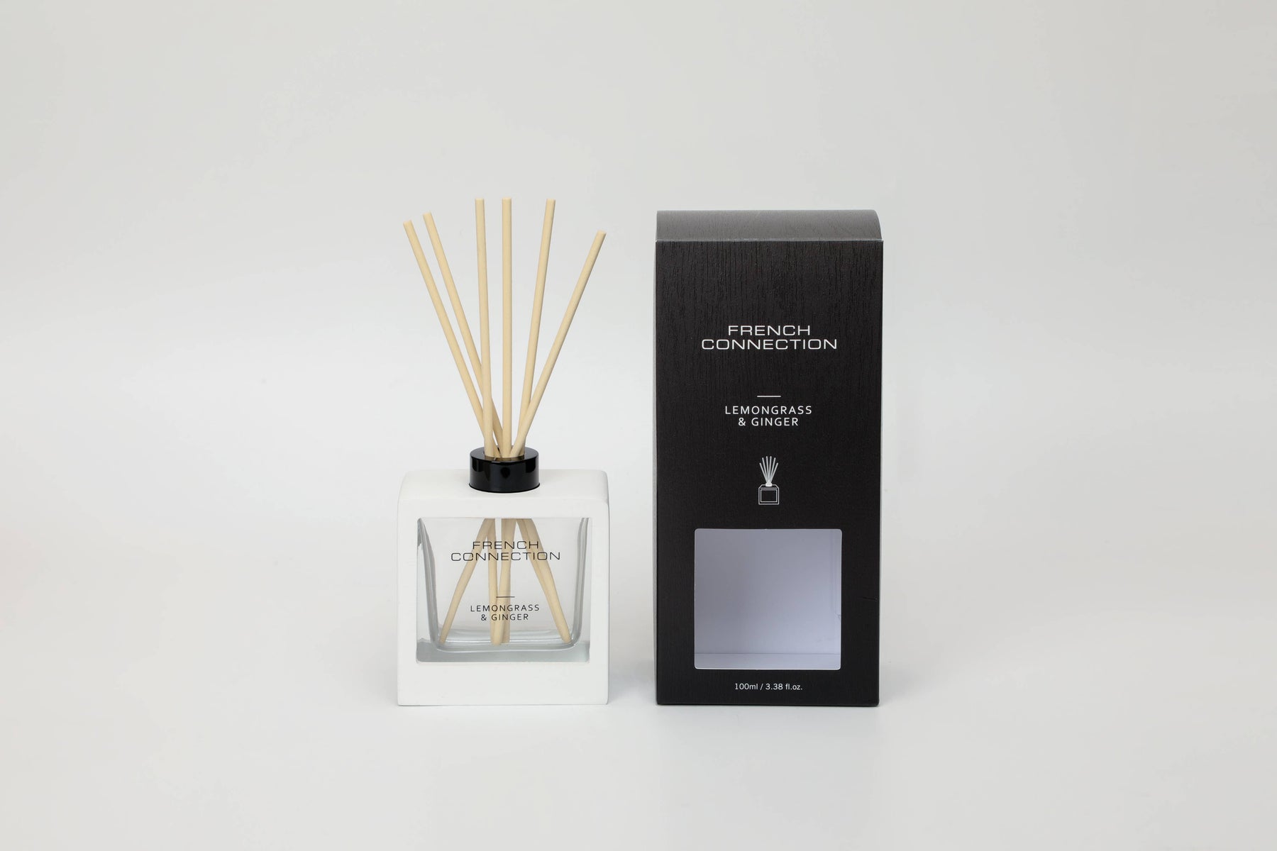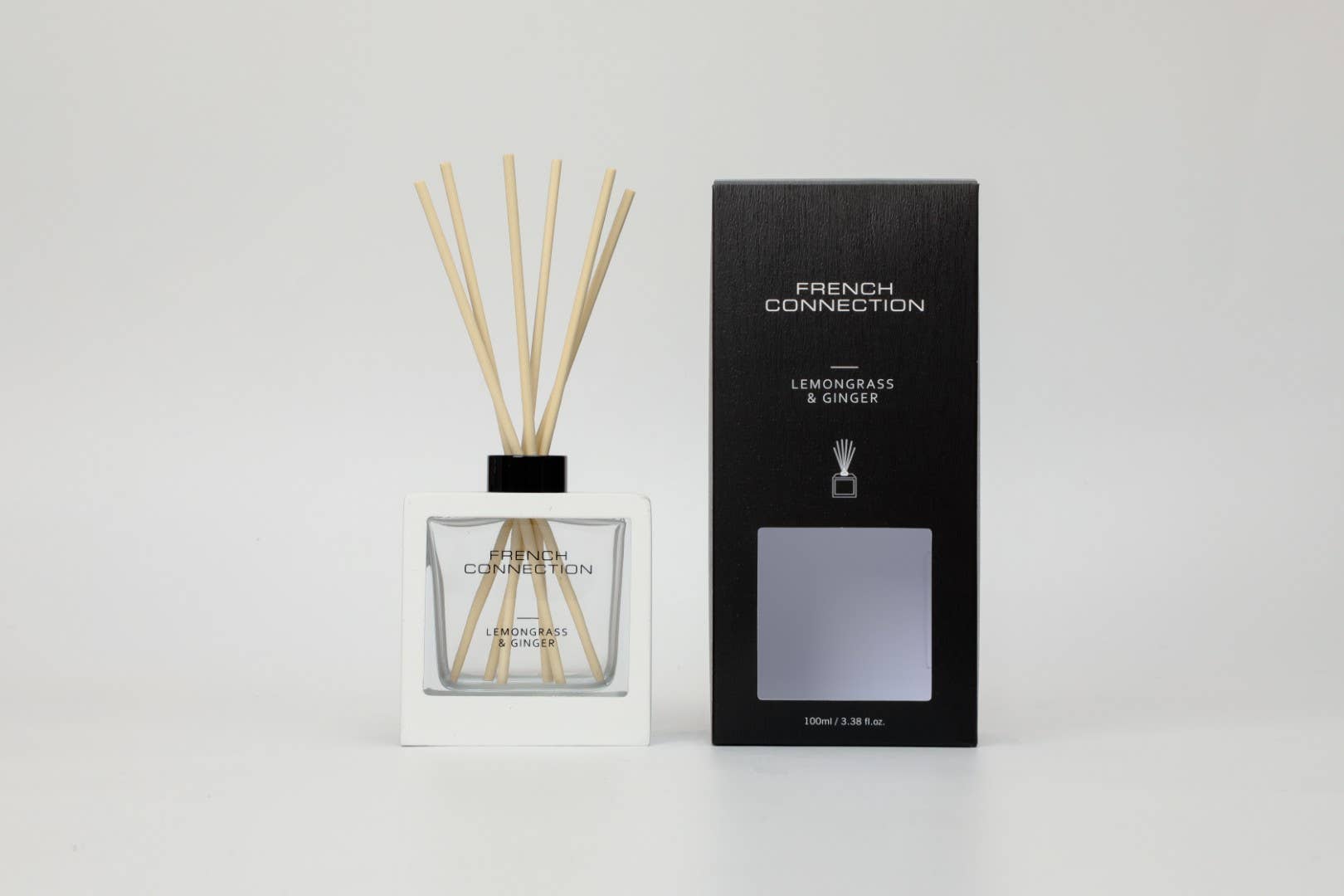 French Connection White Wooden surround Lemongrass & Ginger Reed Diffuser 100ML Spec: Liquid diffuser Material: DPM Fragrance percentage: 15% Size: L98*W43*H216mm Capacity: 100ml 1 diffuser per pack w/ 6 reeds and wood outline Scent option: Lemongrass & Ginger.