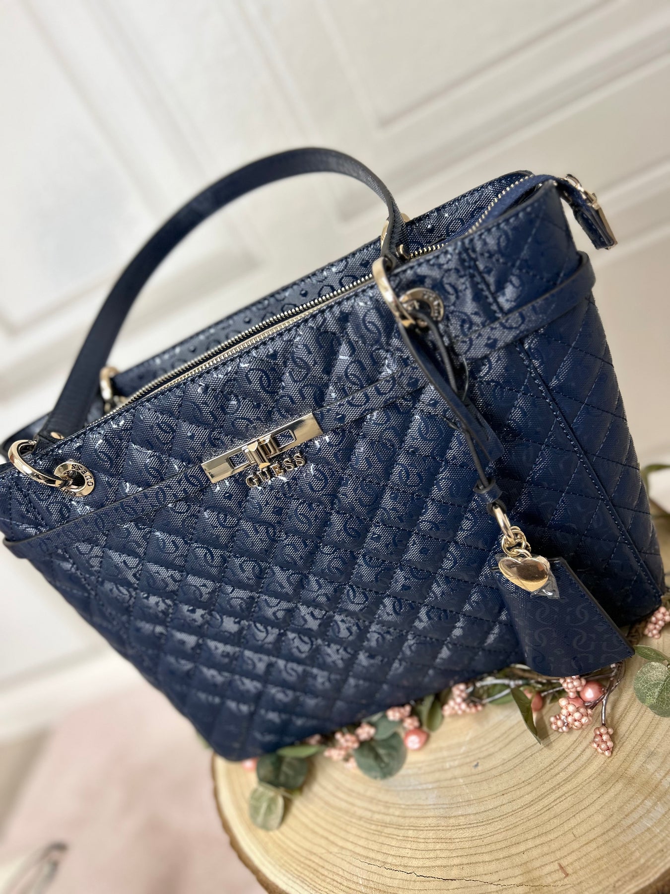 This large navy shoulder bag from Guess is designed for maximum comfort and ease of use. Featuring two handles that can be worn over the shoulder, this bag is perfect for carrying all your essentials while on the go. Its sleek design and spacious interior make it a stylish and practical addition to any outfit.