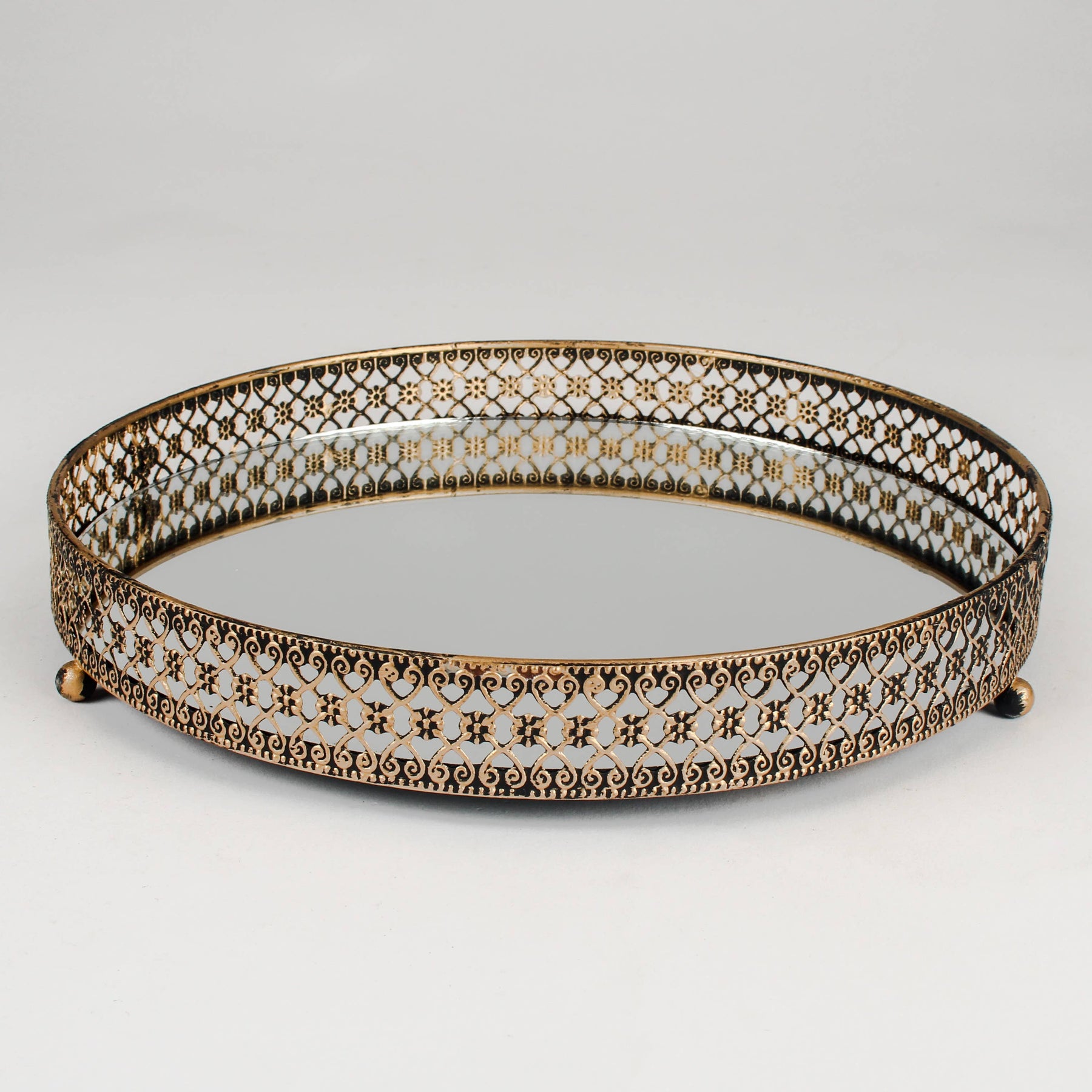 Elevate your home decor with this stunning antique gold mirrored tray. Designed with an intricate filigree metal frame, this tray exudes vintage elegance while providing a practical surface for display. The reflective mirror base enhances the beauty of your decorative pieces, making it a luxurious accent for vanity tables, coffee tables, or serving setups.