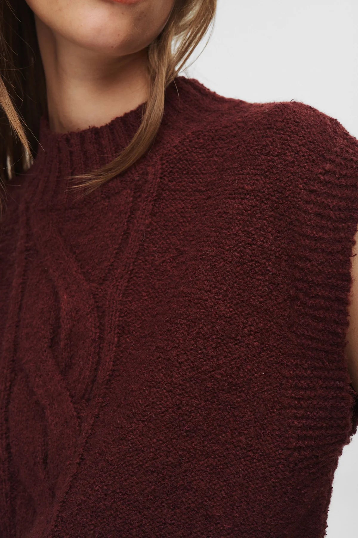 A timeless knit with a modern edge. The NUCALY Vest in Winetasting brings cozy sophistication to your layering lineup. Designed in a rich, deep burgundy hue, this sleeveless knit features a chunky cable detail down the front, adding texture and dimension to its simple silhouette.
