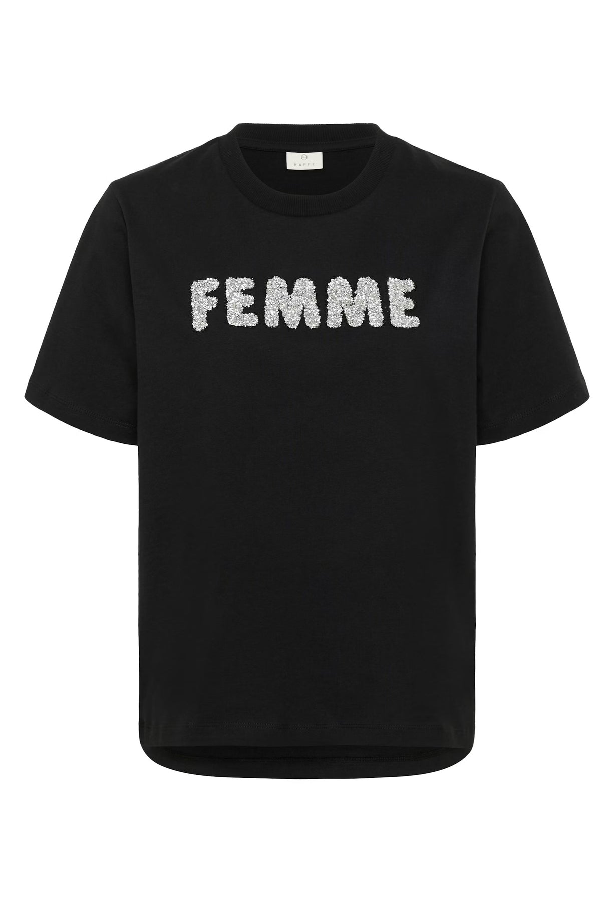 Sequin T-shirt with a straight fit and short sleeves. Features a classic crew neckline and bold sequin 'FEMME' lettering on the front for standout style.