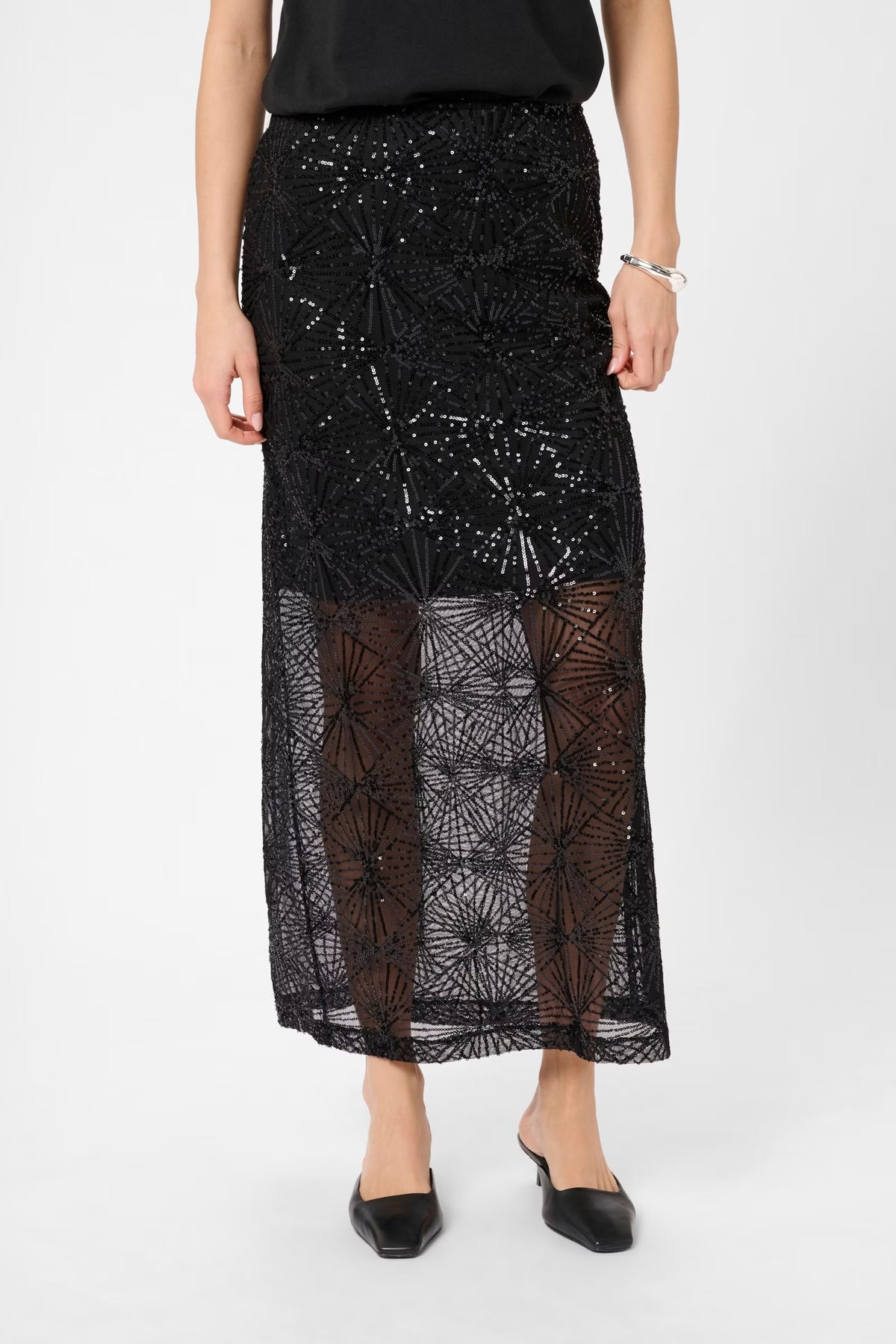 This long skirt features a straight silhouette with geometric sequin detailing and a sheer mesh overlay. Fitted waist and ankle-length cut create a sophisticated, modern look that delivers bold texture and standout shine.