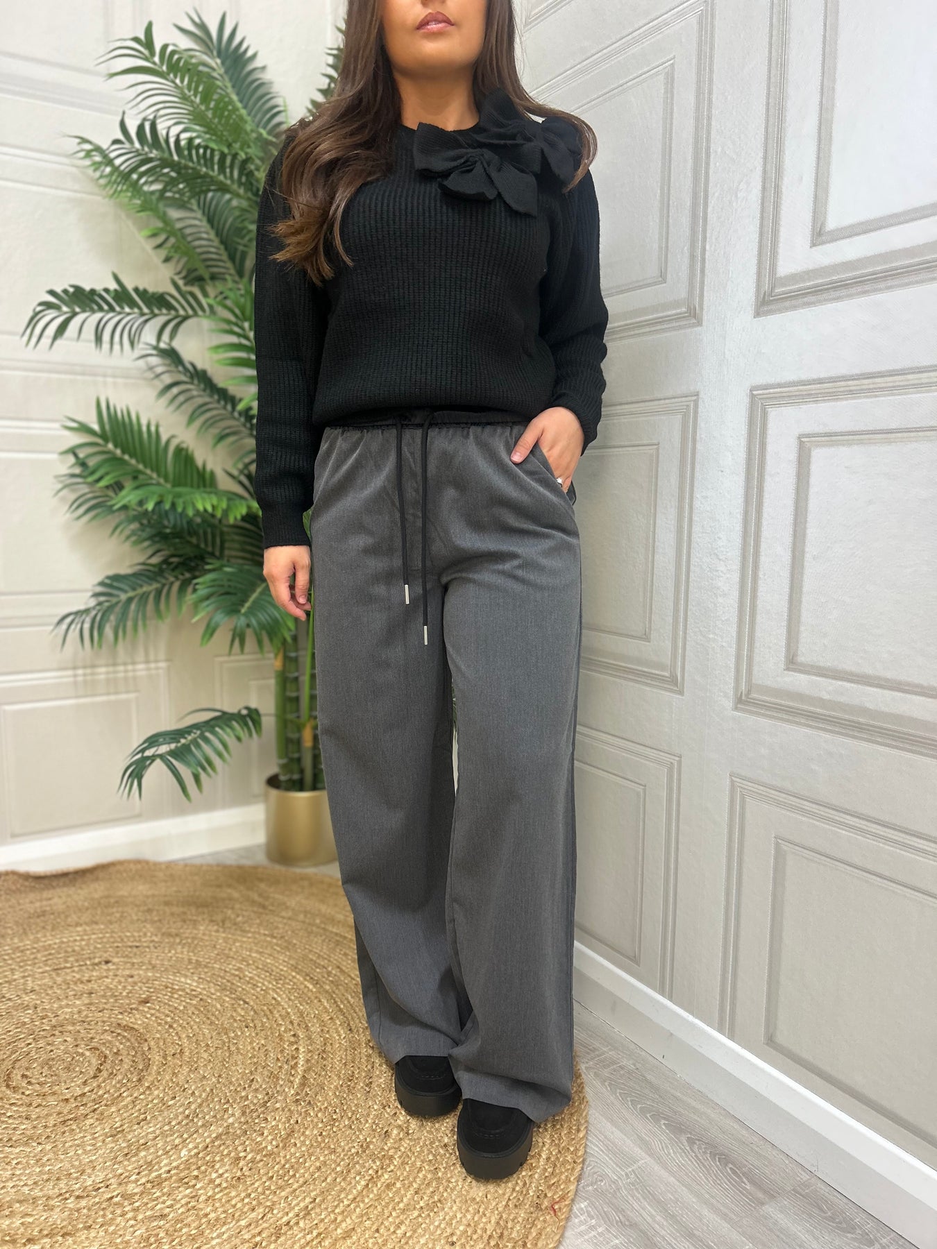 Kaffe KAnevil wide leg pants for women in dark grey offer a relaxed fit, elastic feature waistband with adjustable drawstring, and flowing silhouette. Designed for comfort, these trousers are ideal for versatile styling, from casual to smart casual occasions.