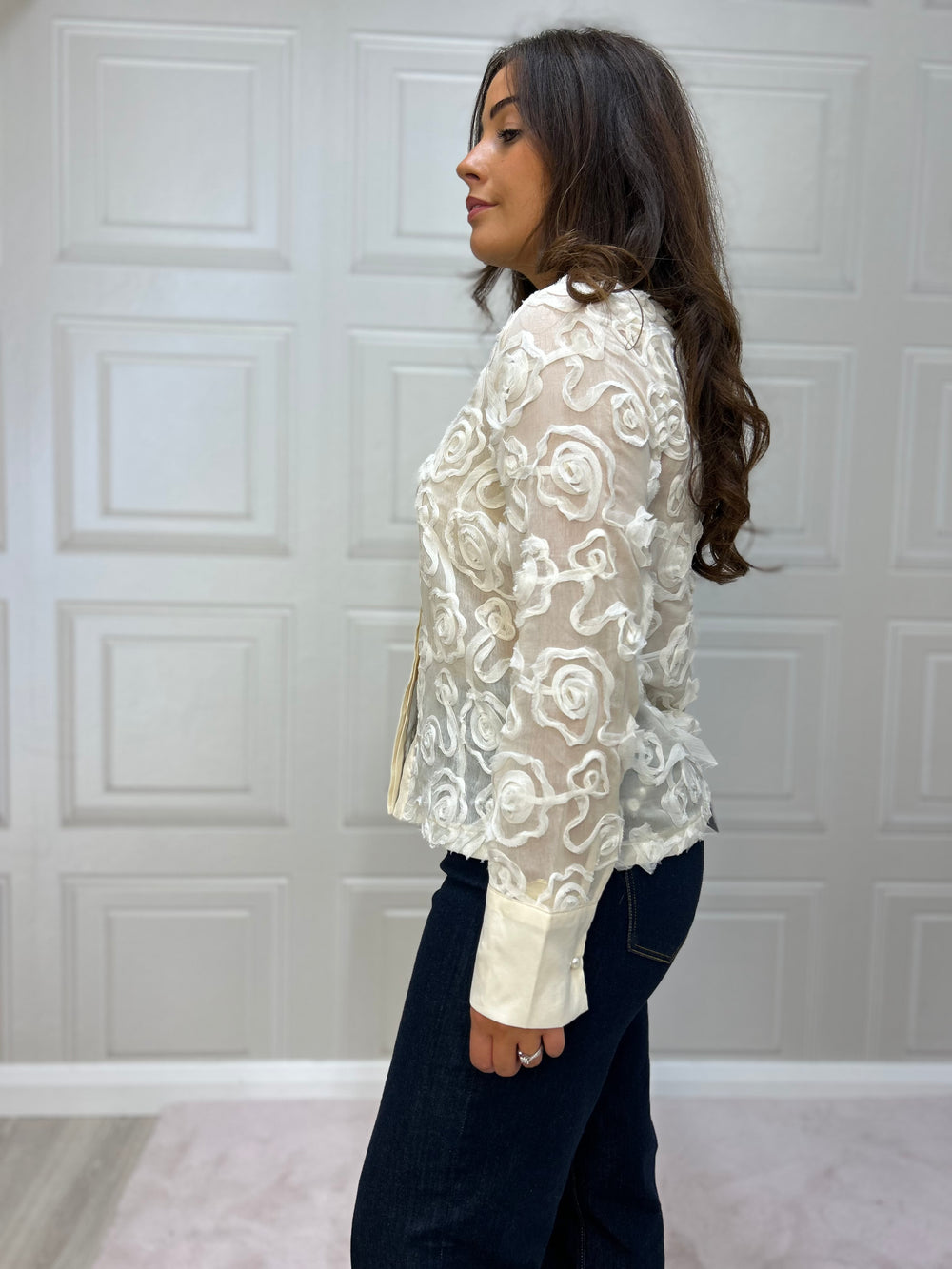 Elevate your wardrobe with this stunning Costa Mani Sheer Floral Blouse, a perfect blend of elegance and modern sophistication. Crafted from delicate sheer fabric, this blouse features intricate 3D floral embroidery that adds texture and femininity to your look. The contrasting cream collar and cuffs lend a refined touch, while the pearl detailing along the collar brings a hint of glamour.