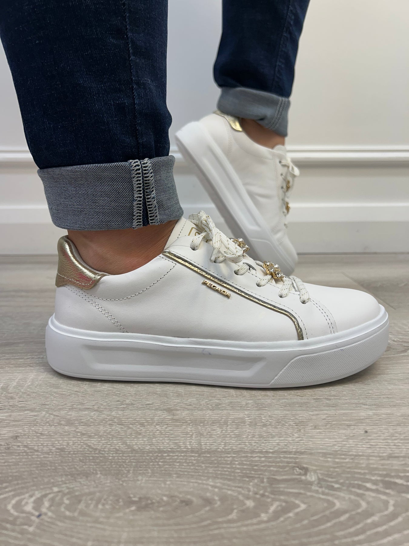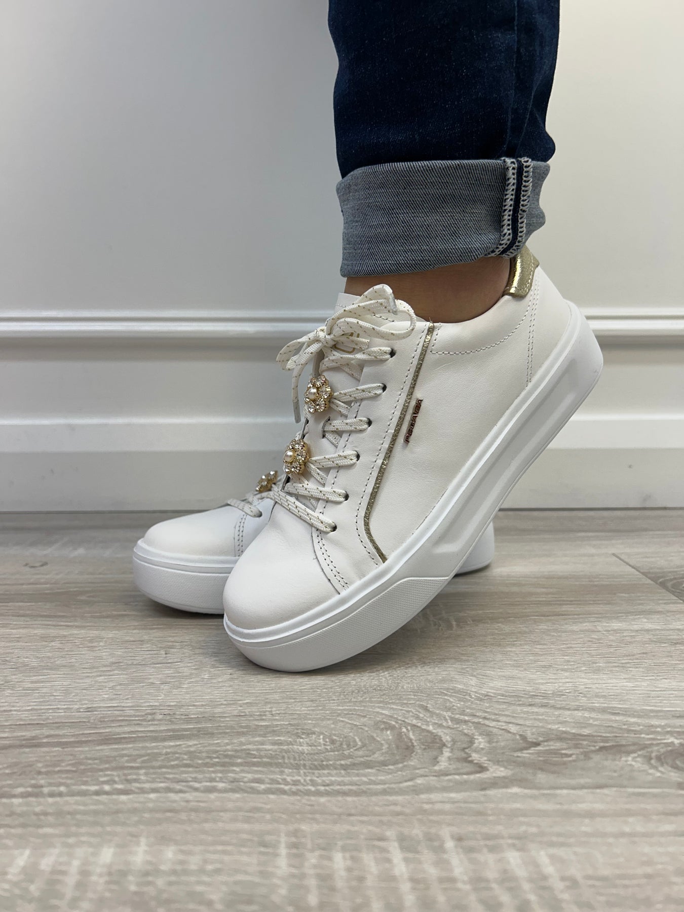 The Pegada Napa Soft Branco - Burnished Ouro Sneaker is a stylish and lightweight option for your footwear collection. Crafted with white leather, it features gold and white laces, gold trims, and delicate pearl and crystal flower embellishments. The perfect combination of comfort and sophistication.