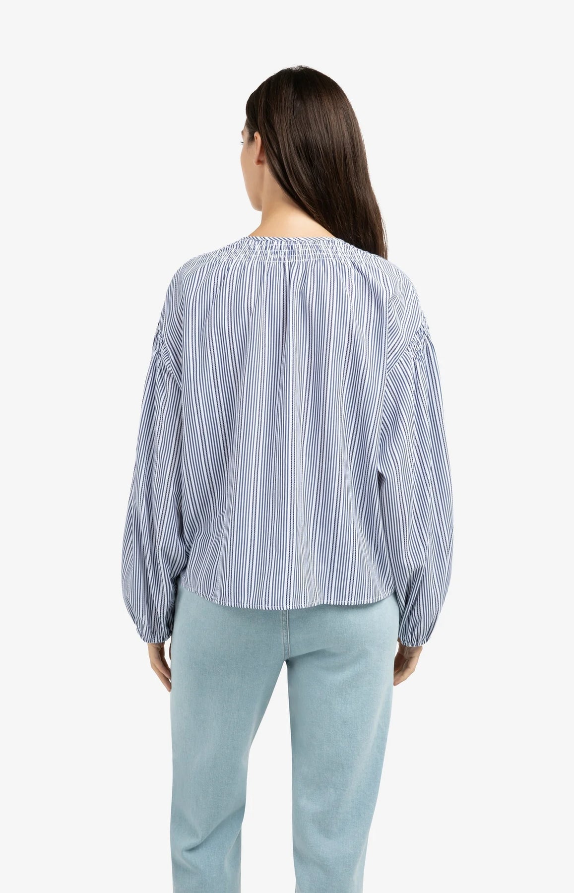 This blue striped blouse is made from a light cotton blend and features a round neckline with delicate shirring. The long puffed sleeves are finished with elastic cuffs. Designed in a loose fit with front button closure, this blouse adds a feminine touch to any casual or chic outfit. The model is 175 cm and wears size 36.