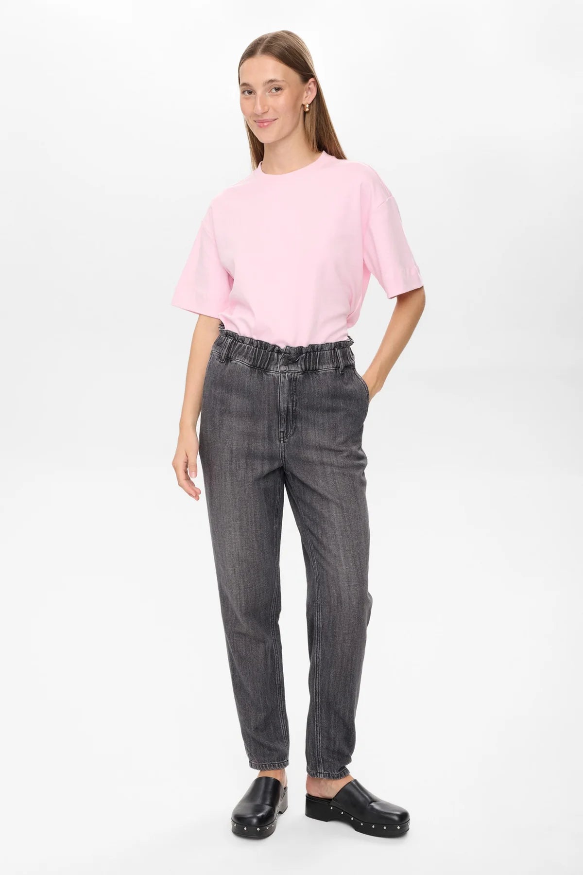 Effortless comfort meets modern edge. The NUSEOUL Paperbag Jeans feature a relaxed, tapered silhouette with an elasticated paperbag waist for a flattering yet laid-back fit. Crafted from soft, medium grey denim, these jeans balance structure and ease, making them a versatile staple for any wardrobe.