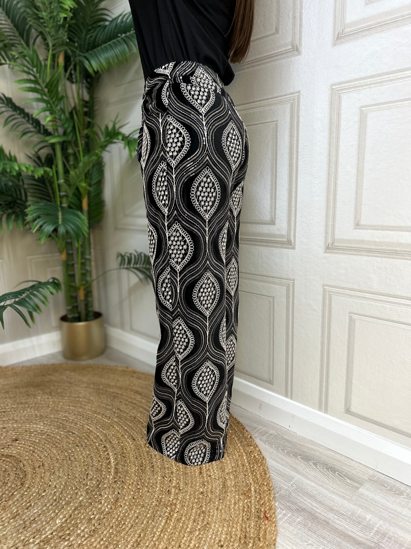 Introducing the Traffic People Lulu Black Trouser. Made of black velvet with sequins and beige stitching design, these trousers add a touch of elegance to any outfit. The perfect blend of comfort and style, they are a must-have for any fashion-forward individual.