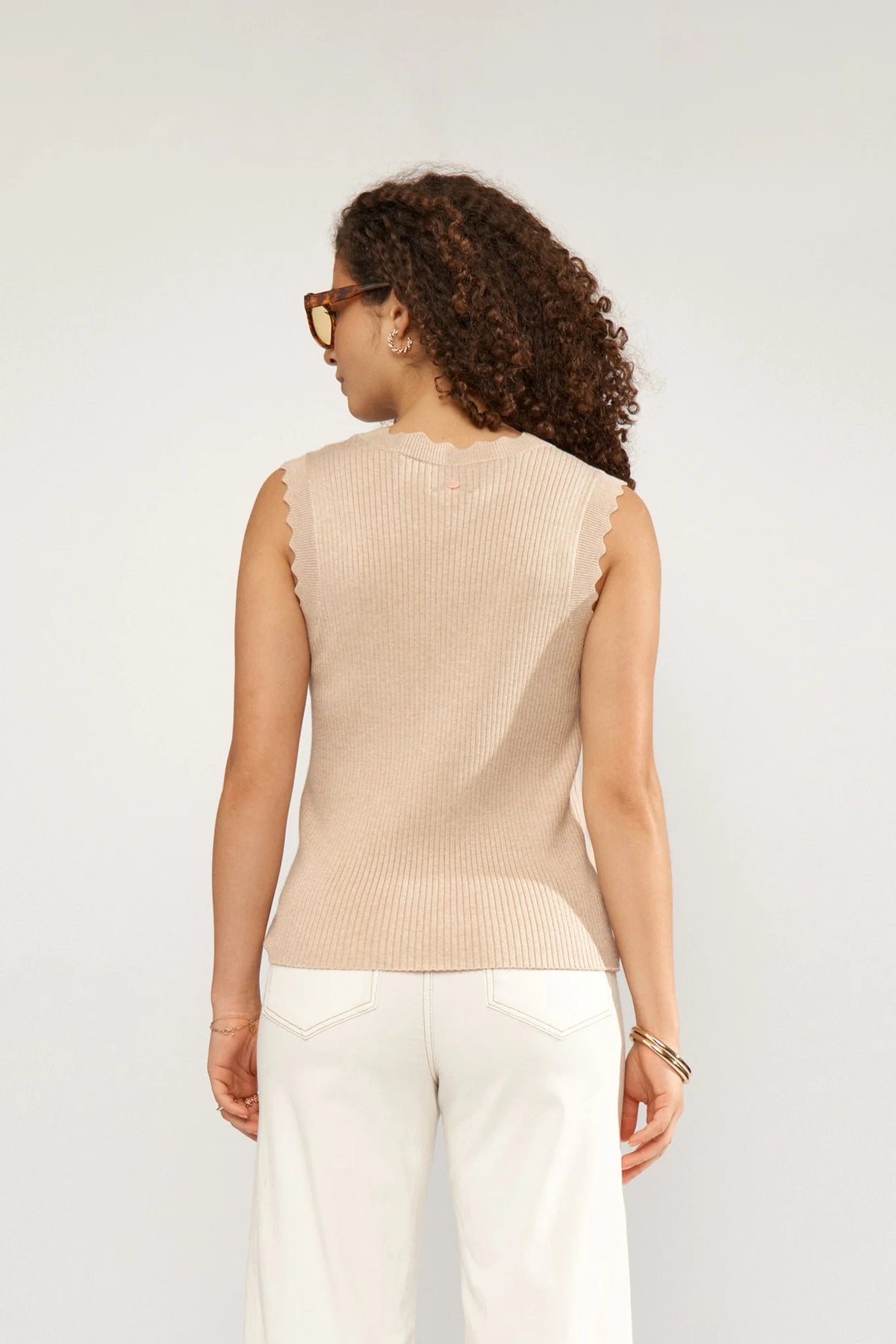 Elevate your wardrobe with this refined sleeveless vest, featuring delicate scalloped detailing that frames the armholes with understated elegance. The button-up front allows for effortless layering and styling versatility, making it an essential piece for both professional and casual occasions. Crafted in a soft Irish cream tone, this timeless silhouette pairs beautifully with everything from crisp white shirts to flowing dresses, offering a sophisticated touch to any ensemble.