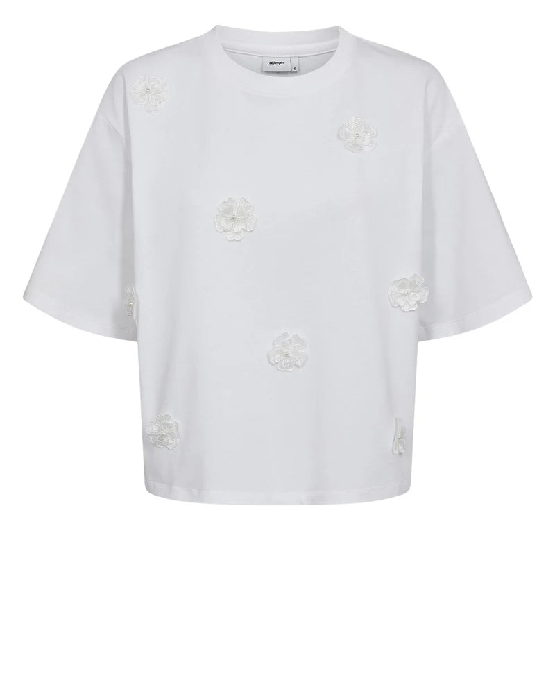 Elevate your everyday wardrobe with this striking Numph Nufleura long t-shirt, crafted from pure 100% cotton for breathable comfort and lasting wear. The sophisticated design features delicate three-dimensional floral embellishments in crisp white, each adorned with a lustrous pearl at its centre—a refined detail that transforms a simple tee into a statement piece. Perfect for layering or wearing solo, this versatile essential brings understated elegance to casual styling.