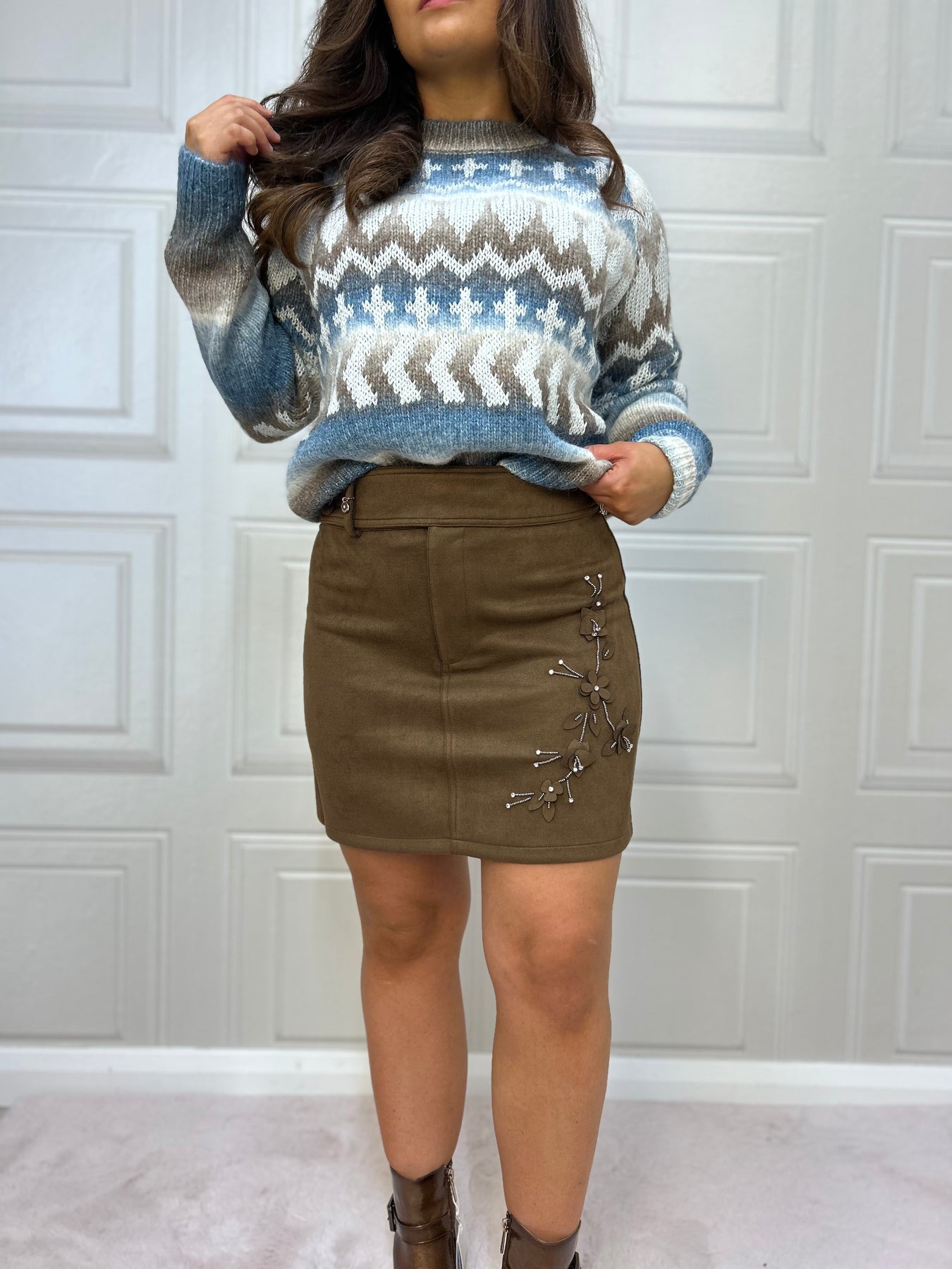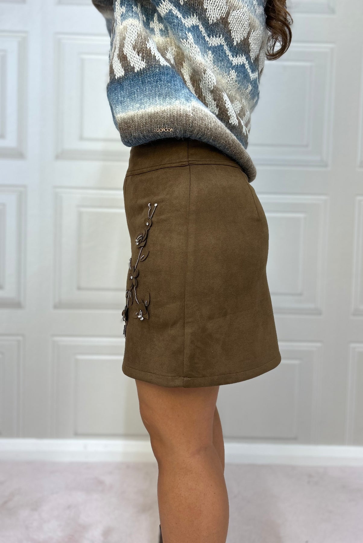 This elegant Goa Goa Caramel Coffee Brown Skirt features exquisite suede floral embellishments, transforming any outfit into a stylish and sophisticated ensemble. The delicate details add a touch of femininity, while the soft material provides comfort and versatility. Elevate your wardrobe with this timeless piece.