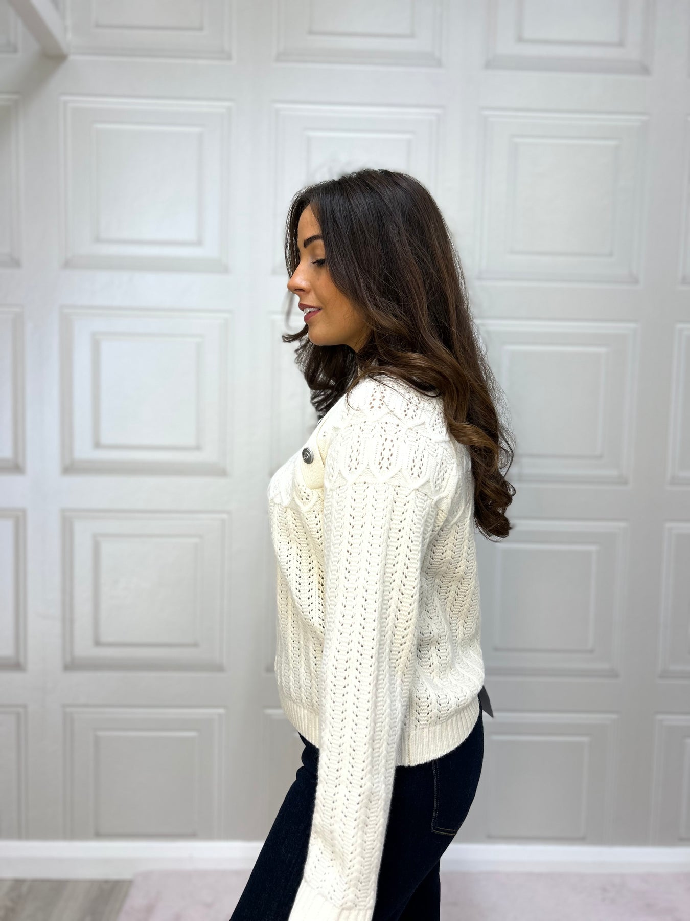 This wool sweater by Goa Goa Surita is made from 100% natural wool. It features silver buttons for a touch of elegance. The wool material provides warmth and comfort, making it perfect for cooler weather. Add a touch of sophistication to your wardrobe with this timeless sweater.
