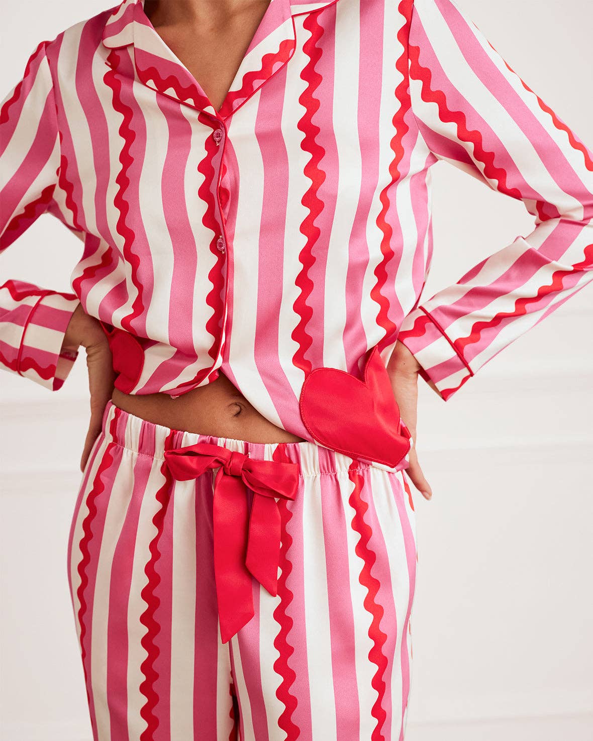 * Curved revere collar shirt * Button-up front * Two heart shaped pockets * Tonal piping * Elasticated waistband * Side pockets * 97% Luxury recycled polyester satin An icon in the making, these show stopping satin pyjamas feature bold red, pink and white printed stripes and two standout pink heart pockets. Playful and a little bit kitsch, these Valentine's pyjamas are of course made to the same exceptional high standard as all Chelsea Peers pyjamas, in the most luxurious recycled fibres satin, and finished with delicate piped trims.